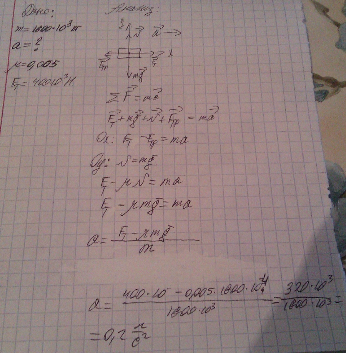 Электровоз трогает с места состав с массой 1600 т.С каким ускорением движется оезд,если коэффициент сопротивления 0,005,а сила тяги 400 КН?