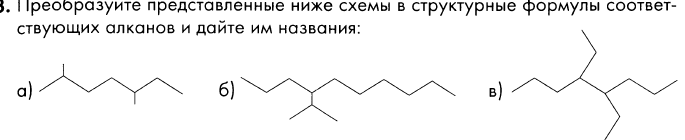 преобразуйте представленные схемы в структурные формулы соответствующих алканов и дайте им названия. пожалуйста помогите