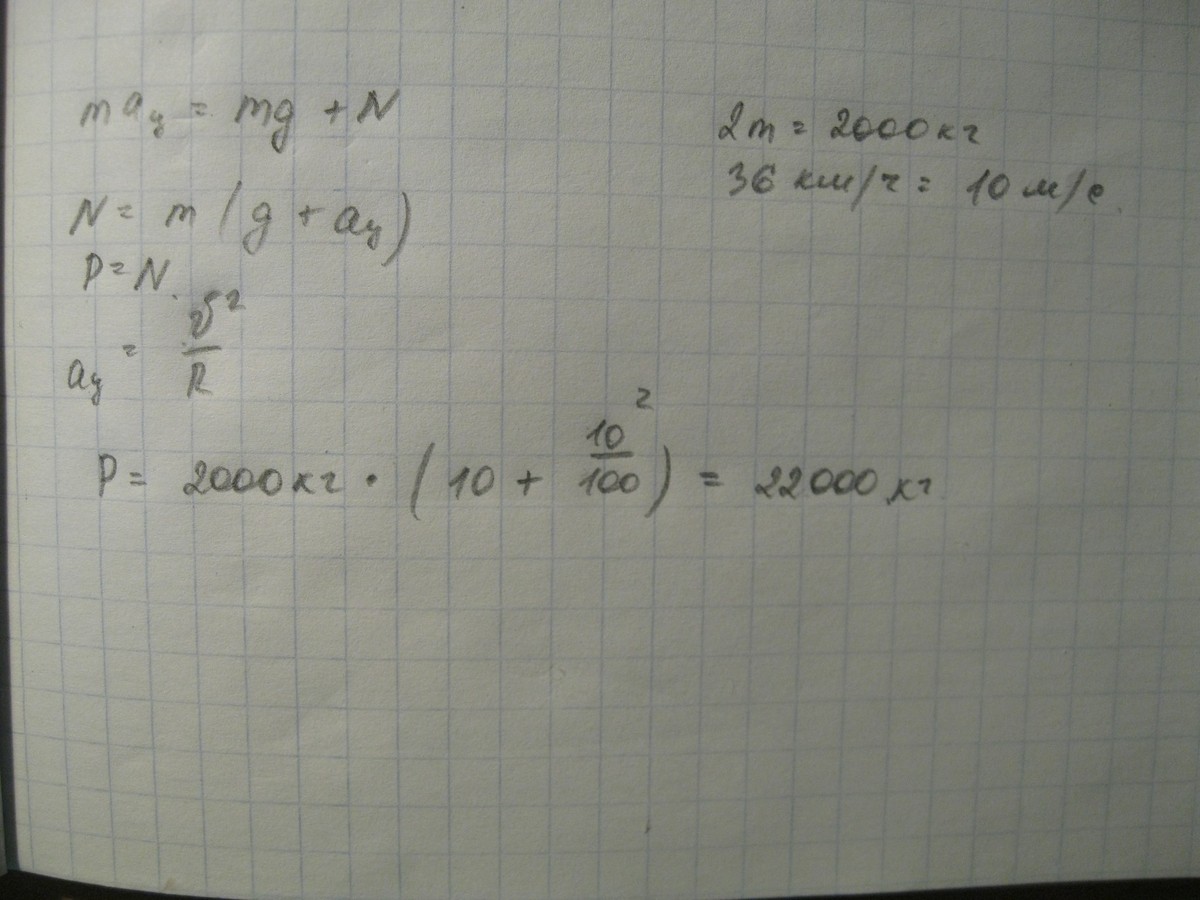 автомобиль массой 2т въехал в яму,радиусом кривизны которой 100 м. Каков вес автомобиля в средней точке ямы, если его скорость 36 км/ч?