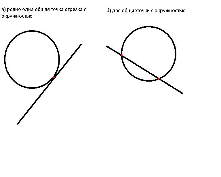 Начерти окружность и отрезок так,чтобы отрезок имел с окружностью:1)только одну общую точку;2)только две одщие точки.