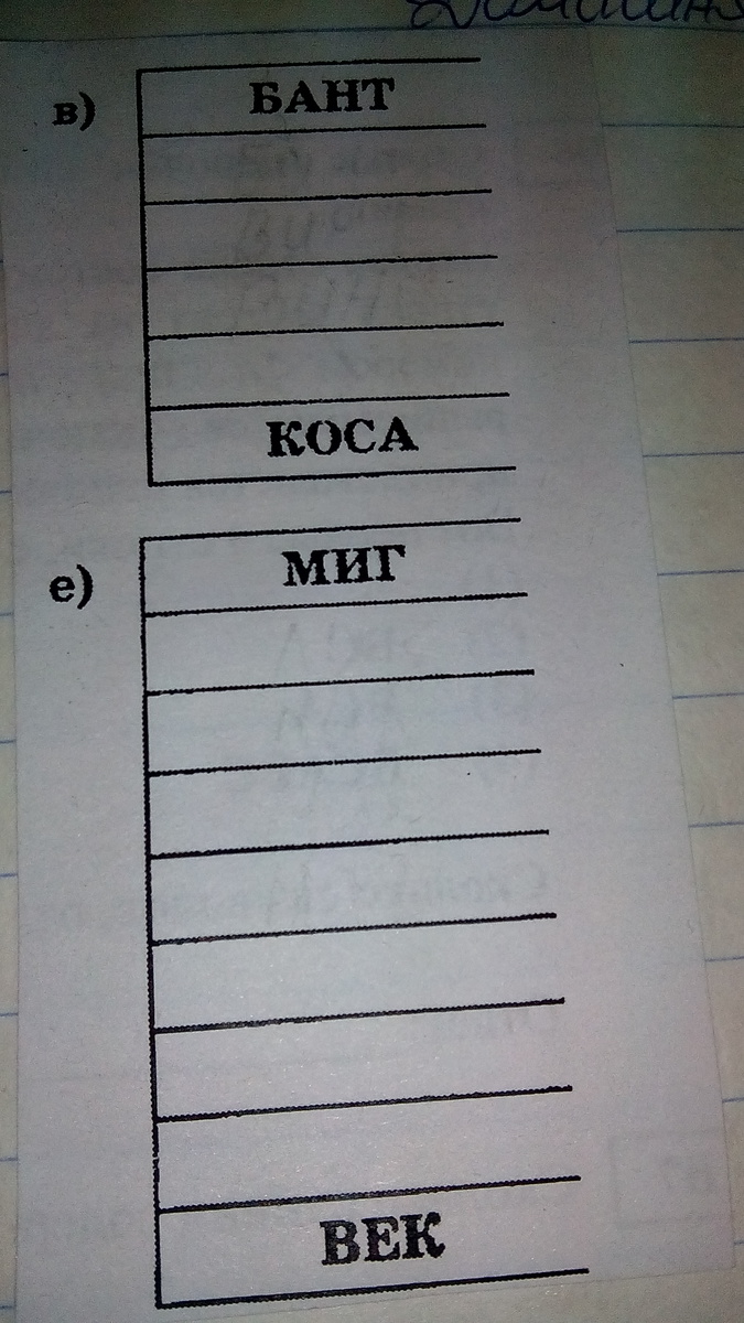 Как из слова БАНТ получить слово КОСА ( чтобы использовать четверо слов и изменять можно только одну букву в слове.) И из слова МИГ ВЕК.