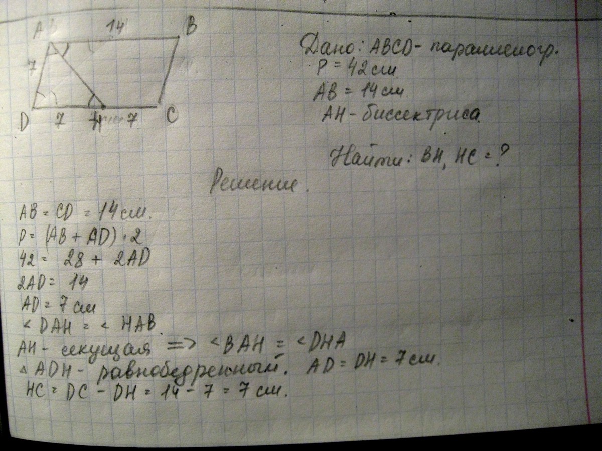 периметр параллелограмма ABCD равен 42 см,AB=14см. какую сторону ABCDпересекает биссектриса угла A?найдите длины отрезков,образованных при этом пересечении