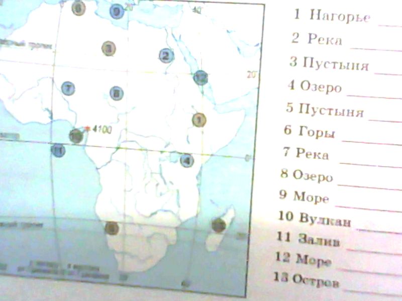 1.Нагорье.2.Река.3.пустыня.4.Озеро.5.Пустыня.6.Горы.7.Река.8.Озеро.9.Море.10.Вулкан.11.Залив.12.Море.13.Остров.
