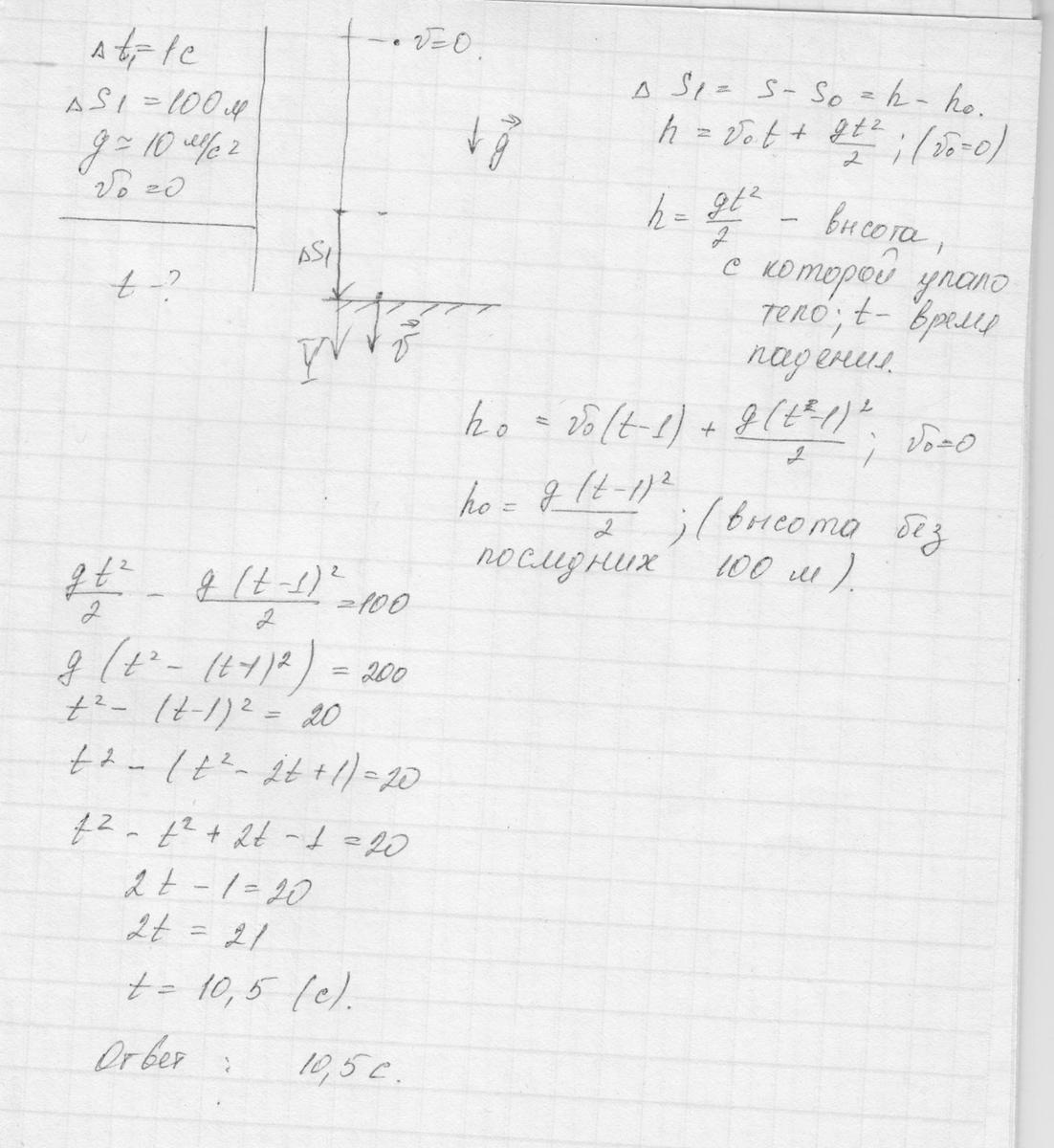 Принцип решения таков: если выразить всю высоту падения через всё время падения, потом выразить высоту падения за исключением последних 100 м через время, которое на 1 с меньше, то эта разница и будет равна 100 м. Получится уравнение, которое и даст нам искомую величину.