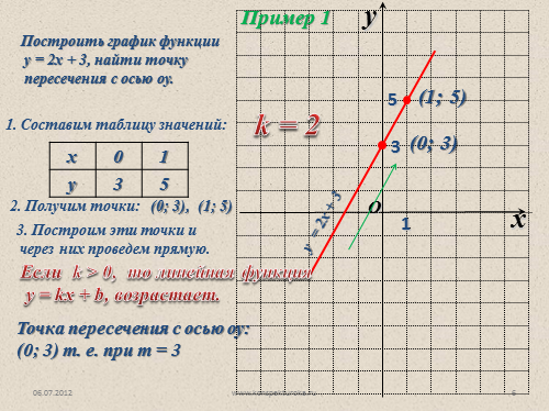 Дальше выбираем другую цифру, например х=1 и подставляем у=2•1+3=5; Можно было подставить и другую цифру, график от этого не изменится!