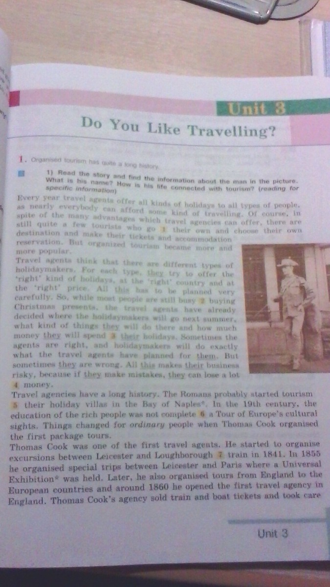 The name of the man in the picture is Thomas Cook. Thomas Cook organised the first package tours. И дальше весь последний абзац до конца