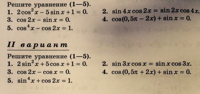 5);sin^4x+cos2x=1\sin^4x+1-2sin^2x=1\sin^4x-2sin^2x=0\sin^2x=t,;sin^4x=t^2,;0leq tleq1\t^2-2t=0\t(t-2)=0\t_1=0,\t_2=2;-;HE;nogx.\sin^2x=0Rightarrowsin x=0Rightarrow x=pi n,;ninmathbb{Z}