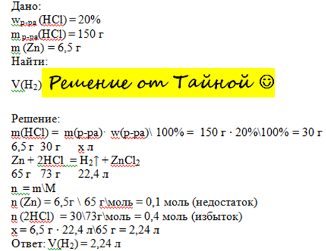 К 6,5г цинка прибавили 150г 20% раствора соляной кислоты. Определите объем водорода при нормальных условиях