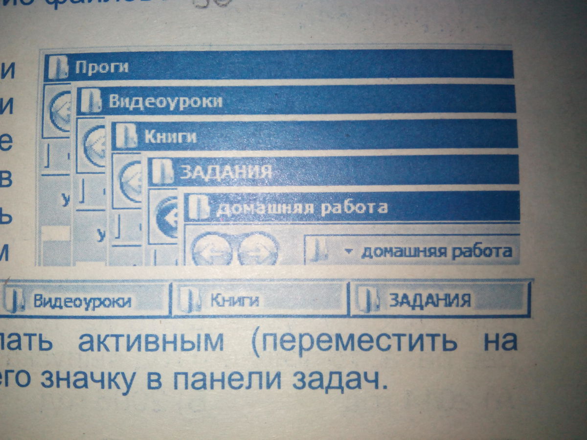расположить эти окна по алфавиту так чтобы на заднем плане оказались (домашняя работа. проги. видеоуроки. книги. задания) папка Видеоуроки? Чтобы окно сделать активным (переместить на передний план), необходимо кликнуть по его значку в панели задач.