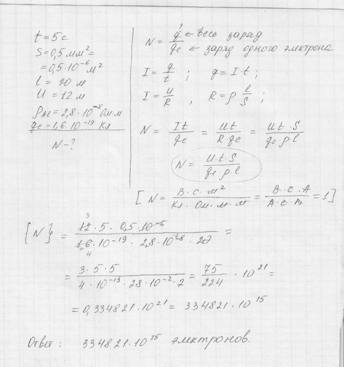Рассчитайте сколько электронов проходит за 5 секунд через поперечное сечение площадью 0,5 кв.мм алюминиевой проволоки длинной 20 м при напряжении на ее концах равном 12 В.