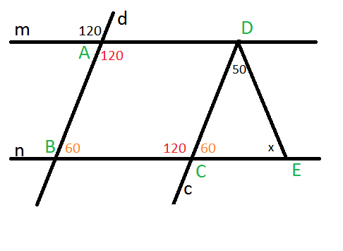 угол ABC=180-120=60 (сумма односторонних углов равна 180 градусам, а углы BAD и ABC односторонние при параллельных прямых m и n);