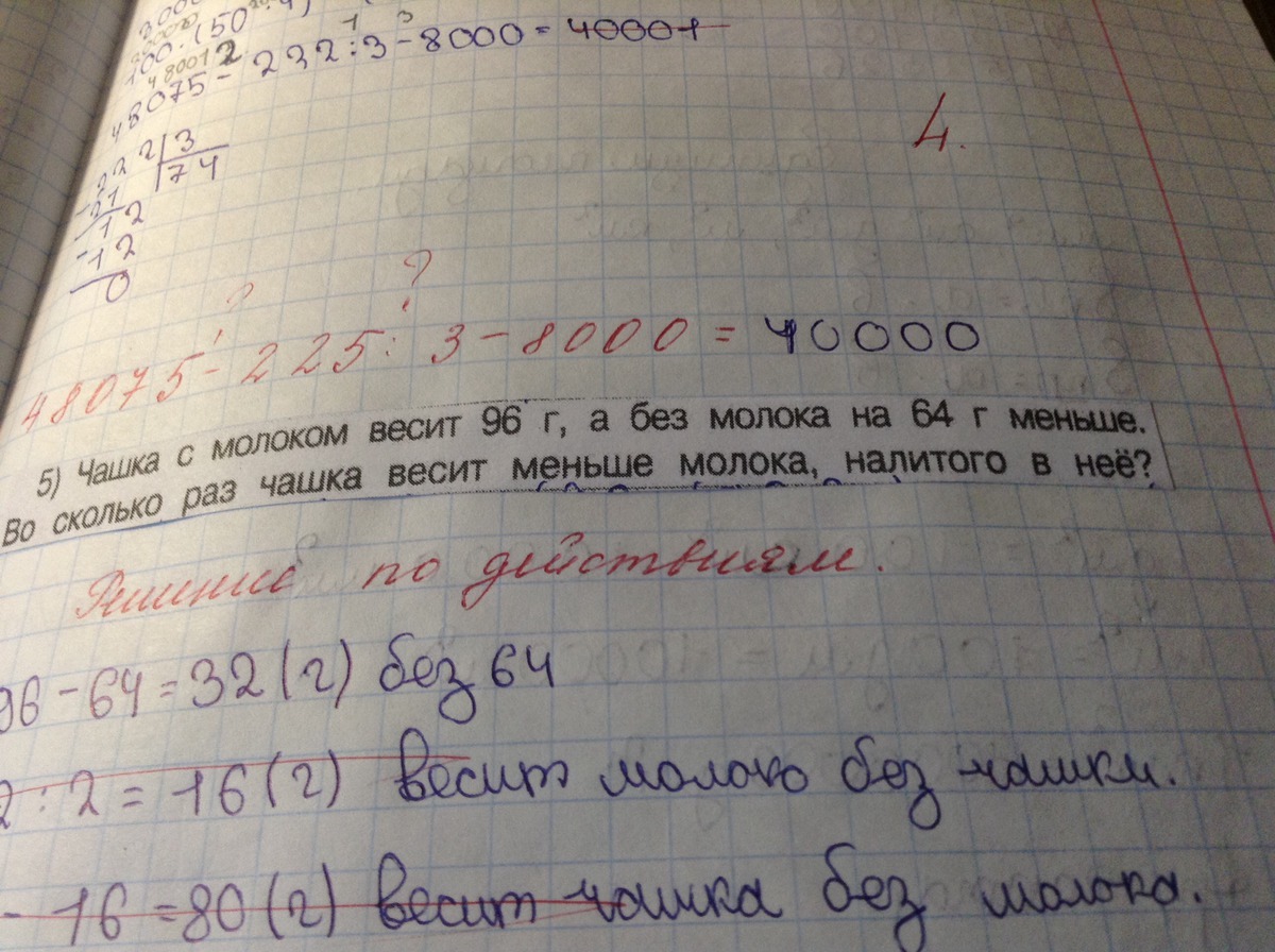 решите задачу по действиям:Чашка с молоком весит96г, а без молока на 64г меньше. Во сколько раз чашка весит меньше налитогов неё?