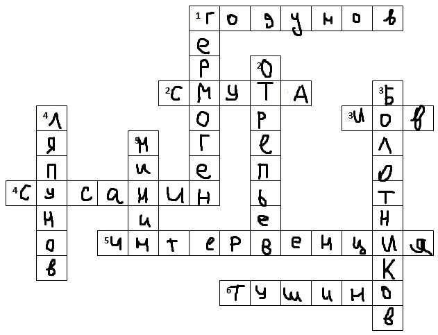 По горизонтали: 1.Кто управлял государством от имени Фёдора Иоанновича? 2.Как называется период русской истории начала XVII в.? 3.Первый патриарх России. 4.Костромской крестьянин, национальный герой России. 5.Насильственное вторжение и захват чужой территории войсками других государств. 6.Подмосковное село, где был основан лагерь Лжедмитрия II. По вертикали: 1.Патриарх, призвавший народ на борьбу с поляками. 2.Авантюрист, монах-расстрига Чудова монастыря. 3.Предводитель восстания 1606-1607 гг. 4.Руководитель Первого ополчения. 5.Нижегородский посадский староста, поднявший народ на защиту Отечества.