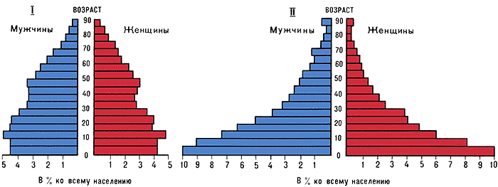 Из вышеприведенных половозрастных пирамид можно сделать вывод, что справа дана пирамида с современным типом воспроизводства, которое присуще развитым странам (значительную часть занимает население старшего возраста, детей не очень много), а слева- с традиционным, которая присуща развивающимся странам (основную долю населения составляют дети,а пожилого населения очень мало из-за высокой смертности).