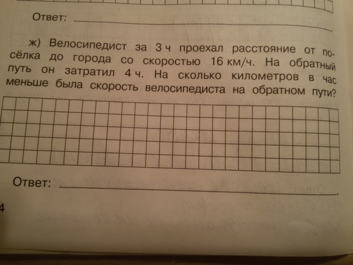 ответ:на 4 км/ч скорость велосипедиста на обратном пути меньше