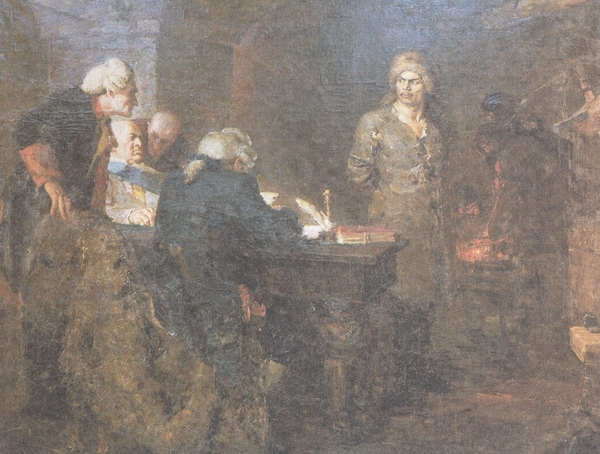 2 На переднем плане художник изобразил представителей власти, ведущих допрос батыра. Они сидят спиной к зрителю. А вот Салават изображен к зрителям лицом.