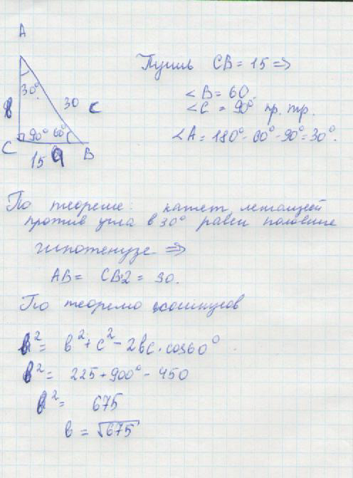 1. Треугольник АВС, угол С=90градусов, угол А=60градусов. АС=15.