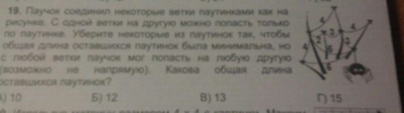 чтобы общая длина оставшихся паутинок была минимальна, но с любой ветки паучок мог попасть на любую другую (возможно не напрямую). какова общая длина оставшихся паутинок?