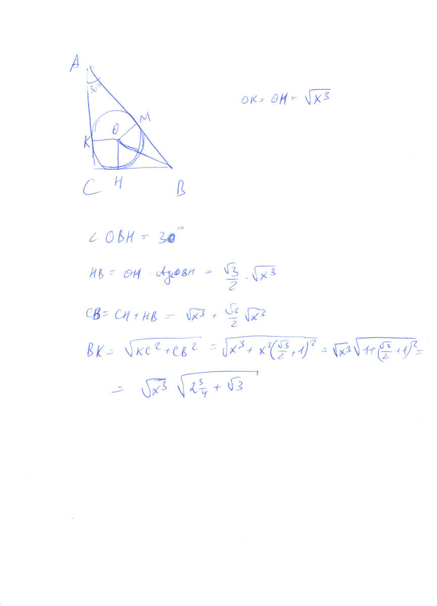 3, вписанная в прямоугольный треугольник АВС с углом А равному 30 градусам, касается катета АС с точке К. Найти ВК.