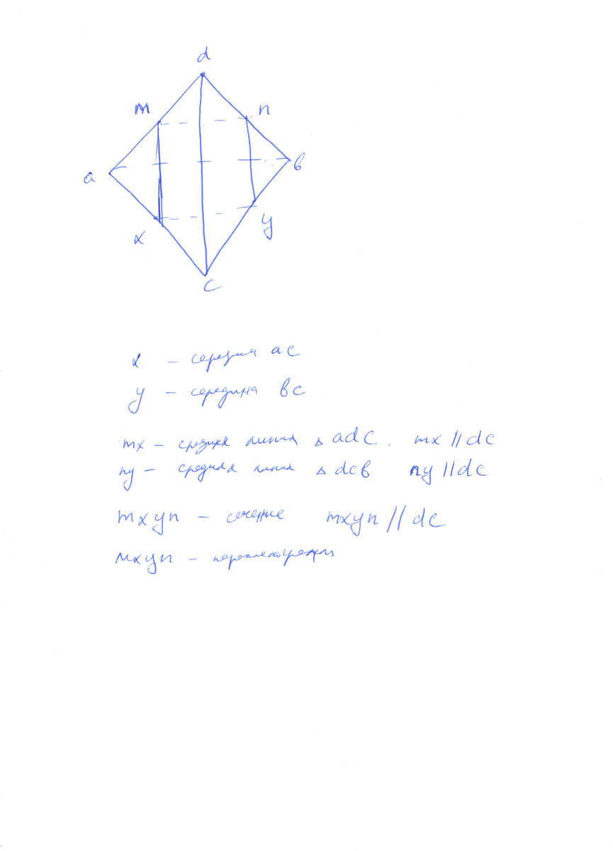 В тетраэдре dabc точки m и n -середины ребер da и db. постройте сечение тетраэдра, проходящее через точки m и n параллельно прямой dc. определите вид сечения.