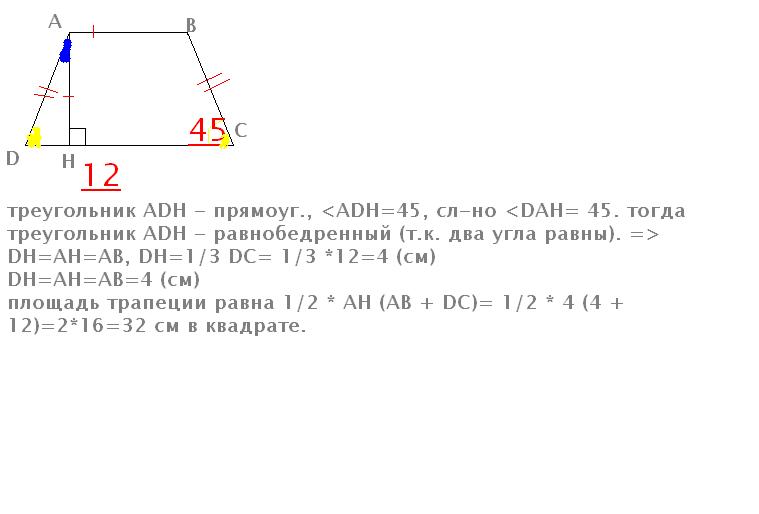 В равнобедренной трапеции угол при основании равен 45 градусам, а высота равна меньшему основанию. Найти площадь трапеции, если большее основание равно 12 см.