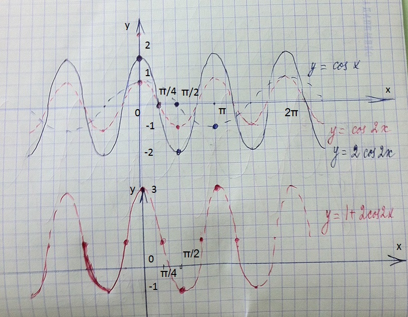 1)Строим обычный косинус, сжимаем в два раза по оси ох. Опорные точки для построения эскиза
