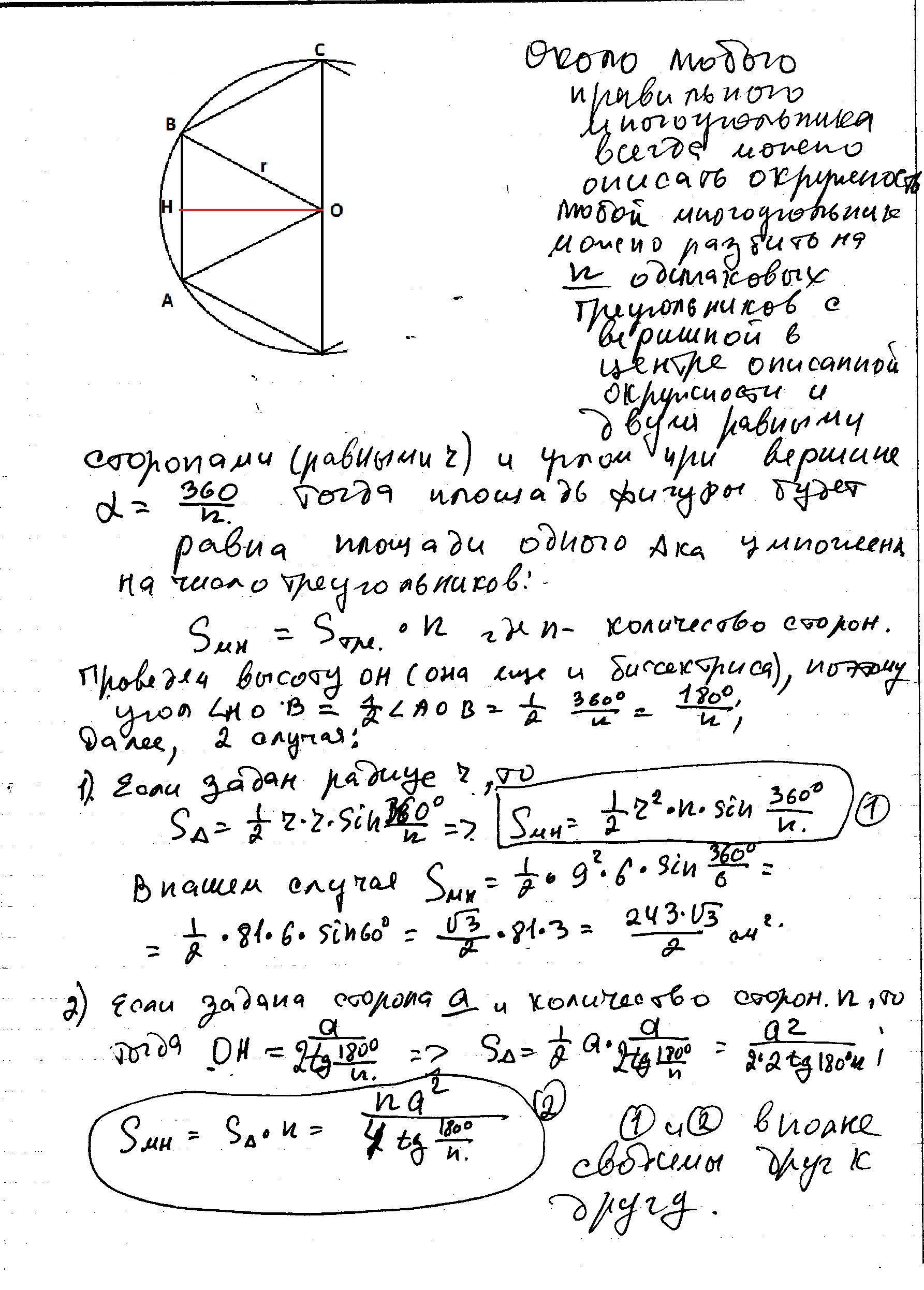 Найдите площадь S правильного n-угольника,если: n=6,r-9 см.