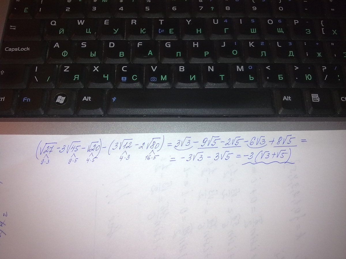 упростите выражение: (корень из 27-3 корень из 45-корень из 20)-(3 корень из 12- 2 корень из 80)