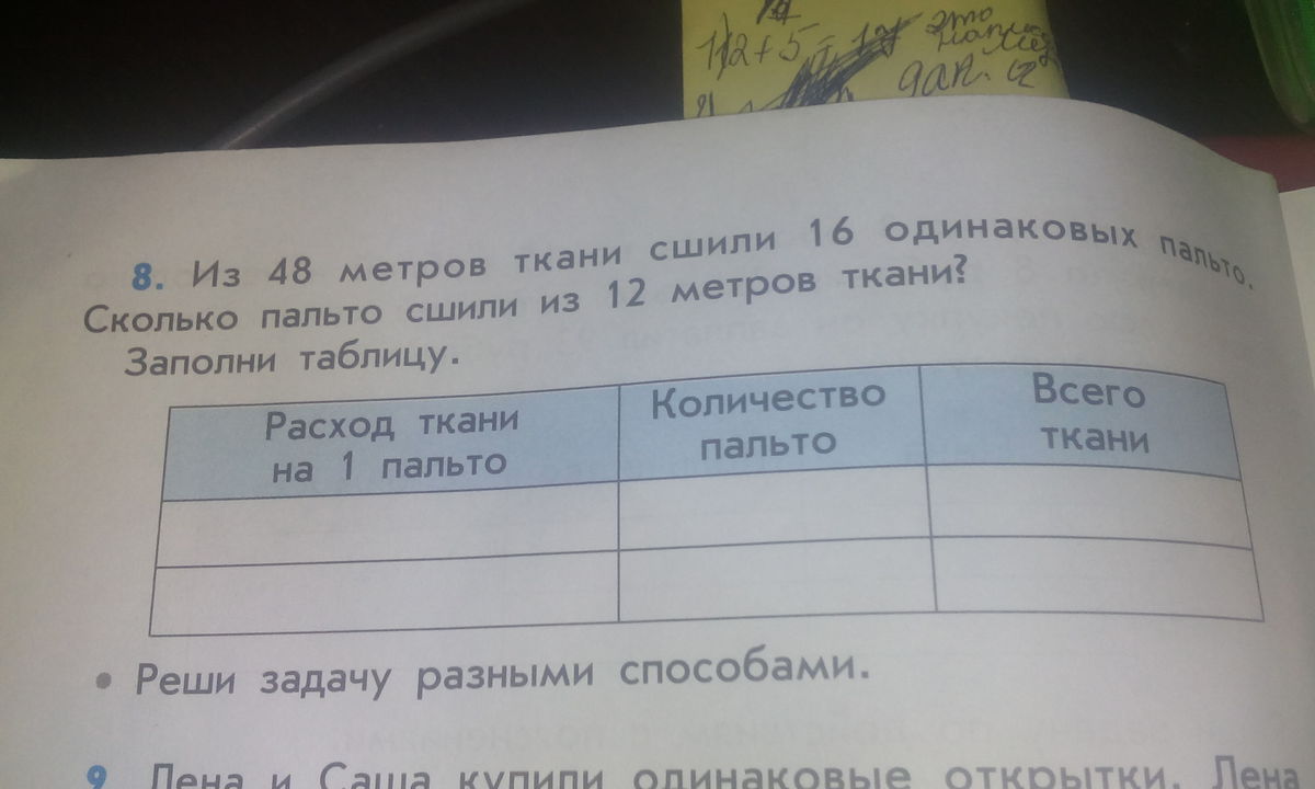 12 / 3 = 4 пальто сшили из 12 метров ткани
