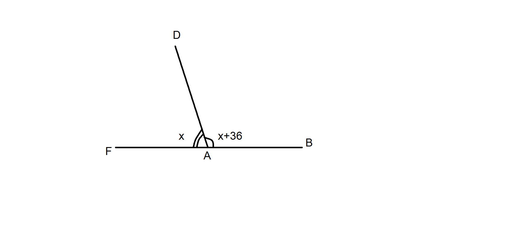 Пускай угол FAD будет х, тогда угол DAB будет х+36. Так, как сума смежных углов будет 180гр., то имеем уравнение: