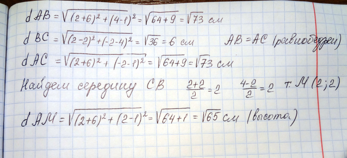 2.Надо найти середину АС, а она равна (назовем ее точкой F) F((-6+2)/2,( 1-2)/2) и того F(-2,-0.5), теперь посчитаем высоту AF, AF = x1*x2 + y1*y2 также посчитай