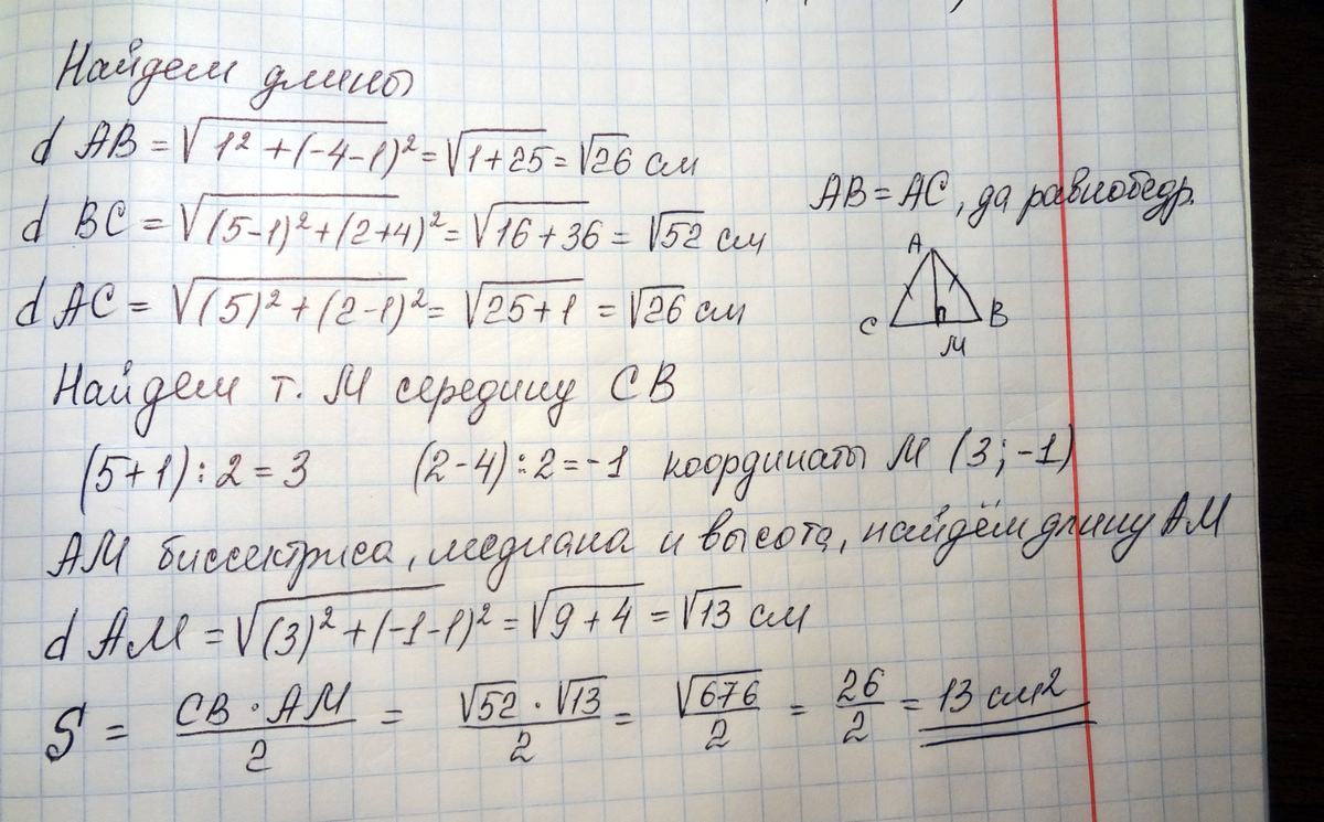докажите,что треугольник АВС равнобедренный,и найдите его площадь,если вершины треугольника имеют координаты:А(0;1)В(1;-4) С(5;2)