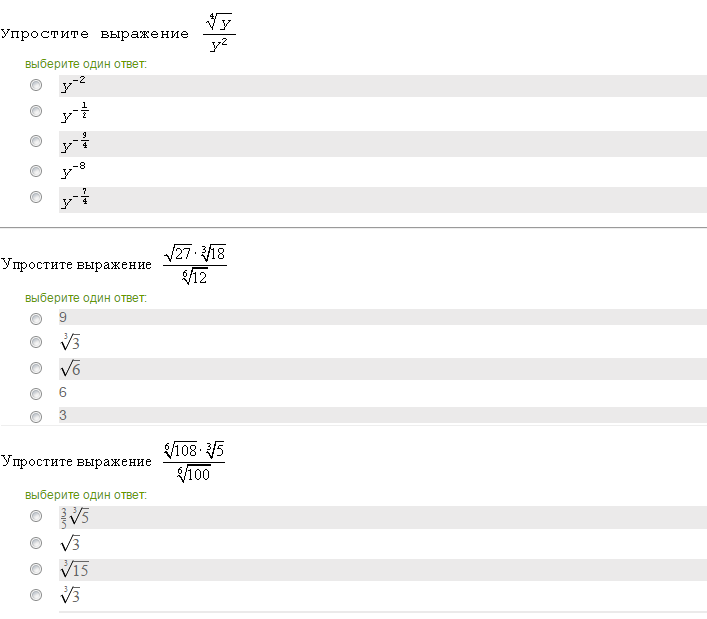 3) [ (108)^(1/6) * 5^(1/3)] / (100)^(1/6) = (2^(1/3) * 3^(1/2))/ (2^(1/3) = √3