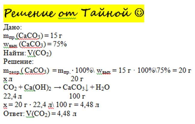 Решите задачу пожалуйста только с дано и с пояснениями. Заранее благодарю. Какой объём углекислого газа пропустили через " известковую воду", если при этом выпало 15 г осадка, что составляет 75 % от теоретически возможного?