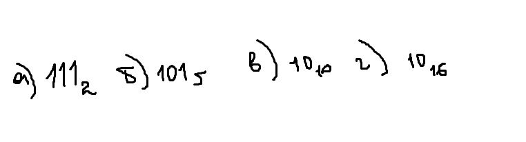 Переводим все числа в десятичную систему: а)7 б)26 в)10 г)16