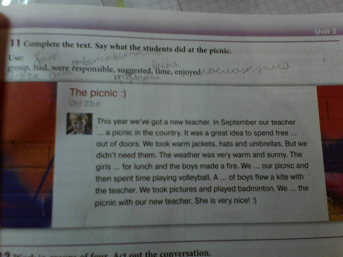 В этом году к нам пришел новый учитель. В сентябре учитель предложил загородный пикник. Это была великолепная идея - провести свободное время вне дома. Мы надели теплые куртки, шапки и перчатки. Но они оказались не нужны. Погода была очень теплой и солнечной. Девочки были ответственны за обед, а мальчики развели костер. Мы наслаждались пикником и проводили время за игрой в волейбол. Группа мальчиков запускали бумажного змея с учителем. Мы фотографировали и играли в бадминтон. У нас был пикник с новым учителем. Она очень милая!