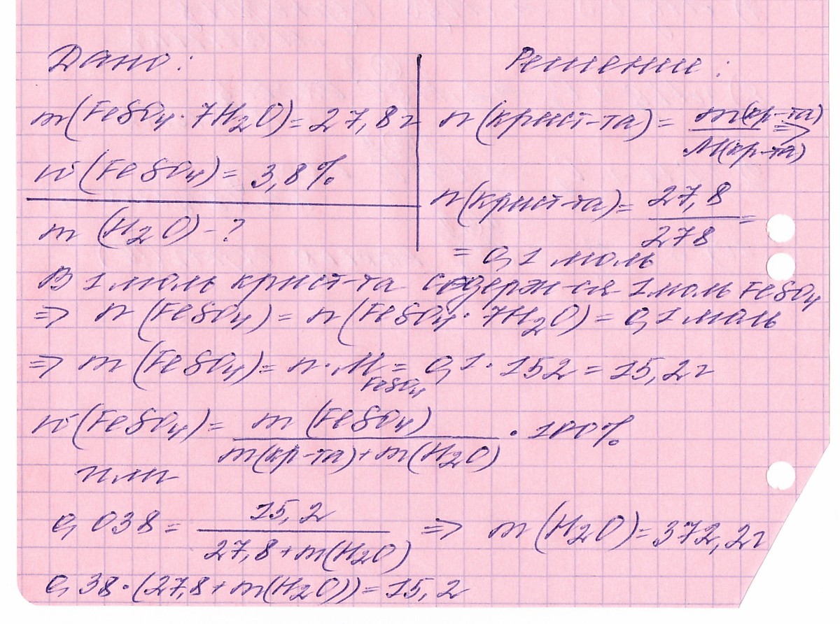 в какой массе воды нужно растворить 27,8 г кристаллогидрата сульфата железа(2) FeSO4*7H2O чтобы получить 3,8%-ный раствор сульфата железа (2) FeSO4