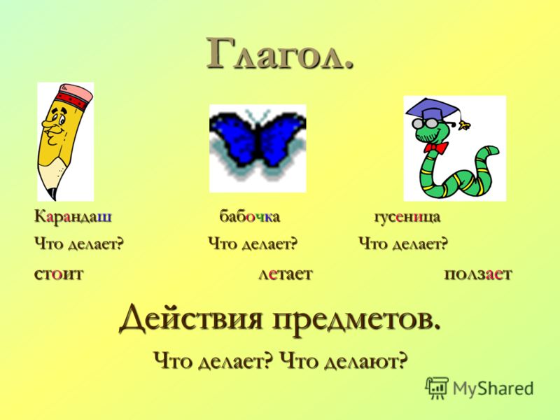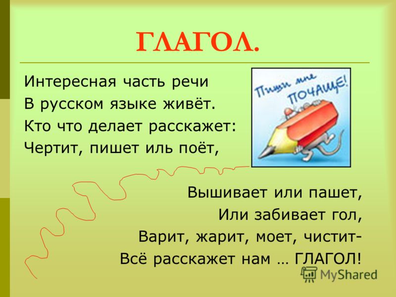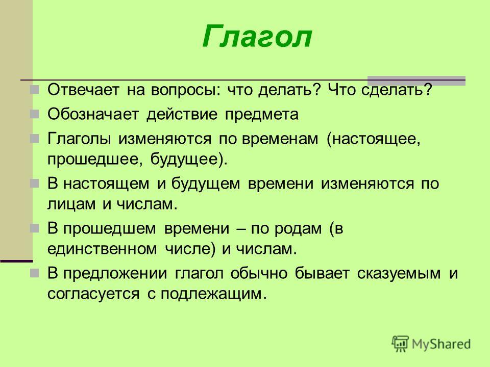 Глаго́л — самостоятельная часть речи, которая обозначает действие или состояние и отвечает на вопросы что делать? что сделать? что делал.