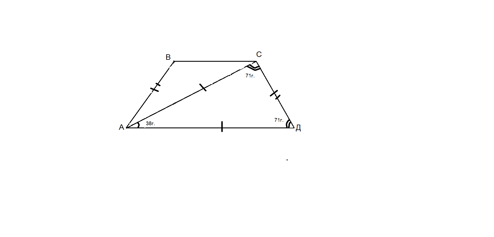 Из треугольника АСД: Так, как он равнобокий, то углы при основании будут равны(АСД=СДА); Пускай АСД будет х, САД=38. Так, как сума всех углов треугольника = 180гр., то имеем уравнение: