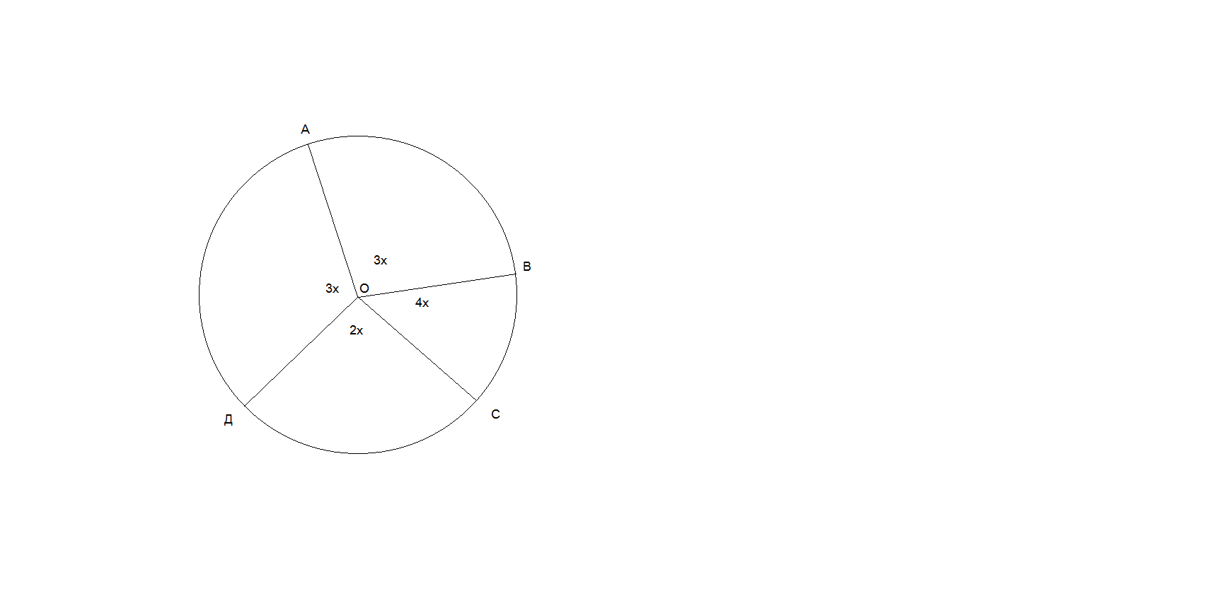 Точки A,B,C,D расположены в данной последовательности на окружности . Найдите градусные меры дуг AB , BC , CD , DA , если они прямо пропорциональны числам 3 ,4,2,3