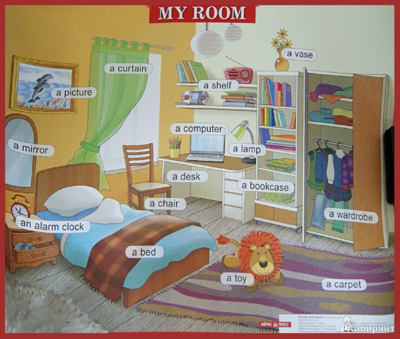 Today i want tell you about my room. My room is big, bright and comfortable. There is a wardrobe in the left corner. There is a sofa near the wall and there is a bookshelf above. In the middle of the room there is a carpet. There is a big window in my room. There is a desk in the right corner. And there are many pictures and photoes above it. There are two chairs near the desk. On the right of the door there is a TV, I like vy room.