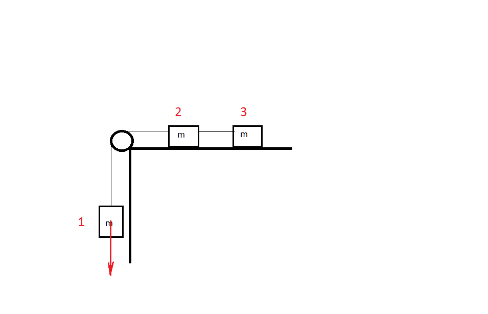 На горизонтальной поверхности лежат два связанных нитью груза массой m каждый. На нити, прикрепленной к этим грузам и перекинутой через неподвижный блок, подвешен такой же груз. С каким ускорением движутся грузы и какова сила натяжения нити между грузами, лежащими на поверхности? Трение не учитывать.