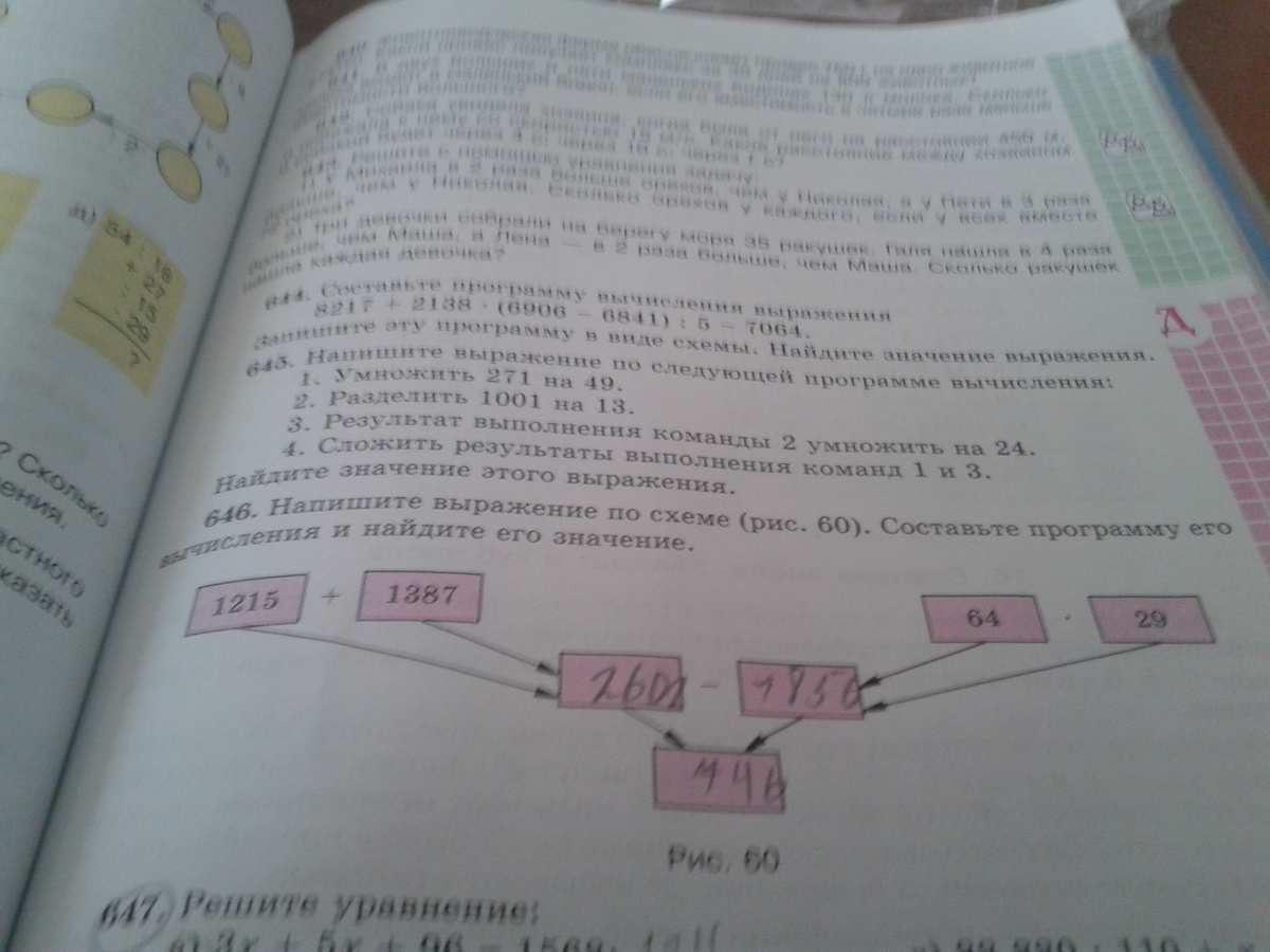 645 1.271*49=13279 2.1001:13=77 3.77*24=1848 4.13279+1848=15127 646 (1215+1387)-(64*29)=746