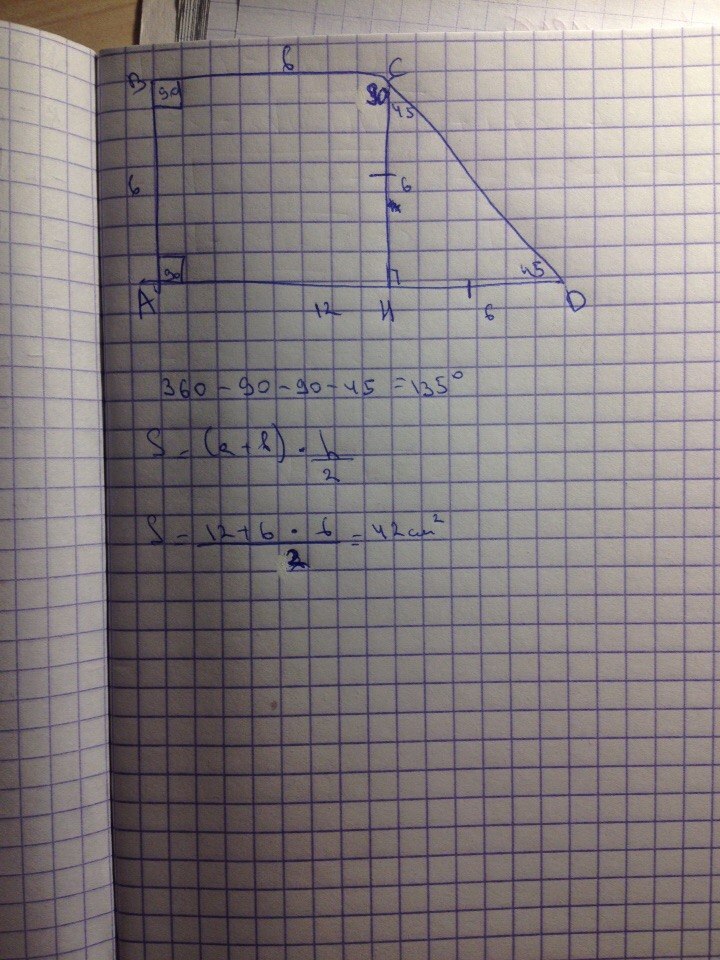 Найдите площадь прямоугольной трапеции, основания которой равны 12 и 6, большая боковая сторона с основанием составляет угол 45 градусов.