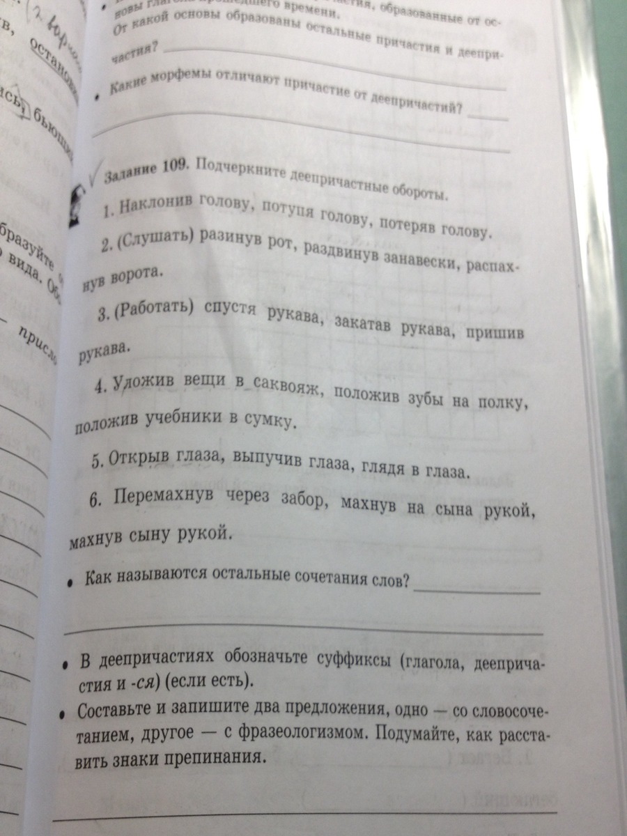 Фразеологизмы ( устойчивые сочетания ):потуп -я голову ,потер-я-в голову ,спуст-я рукава ,полож-и-в зубы на полку ,выпуч-и-в глаза ,гляд-я в глаза , перемахн-у-в через забор ,махн-у-в на сына рукой .