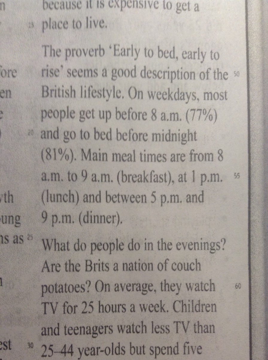 Пословица "Early to bed, early to rise" (кто рано ложится, тот рано встает - если надо перевести) выглядит хорошим описанием британского образа жизни. В выходные большинство людей встает до 8-ми утра (77%) и ложится спать до полуночи (81%). Время основных приемов пищи - от 8 до 9 утра (завтрак), в час дня (ланч) и между 5 и 9 часами вечера (ужин - ну или "обед").