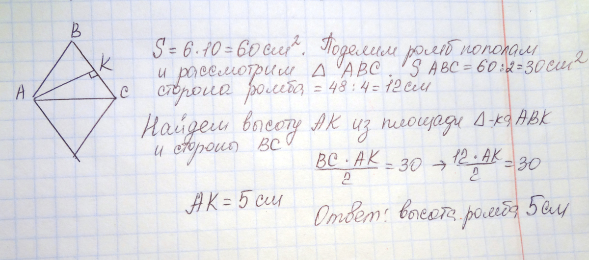 Площать прямоугольника со сторонами 6 см и 10см равна площади ромба с периметром 48 см. Найдите высоту ромба.