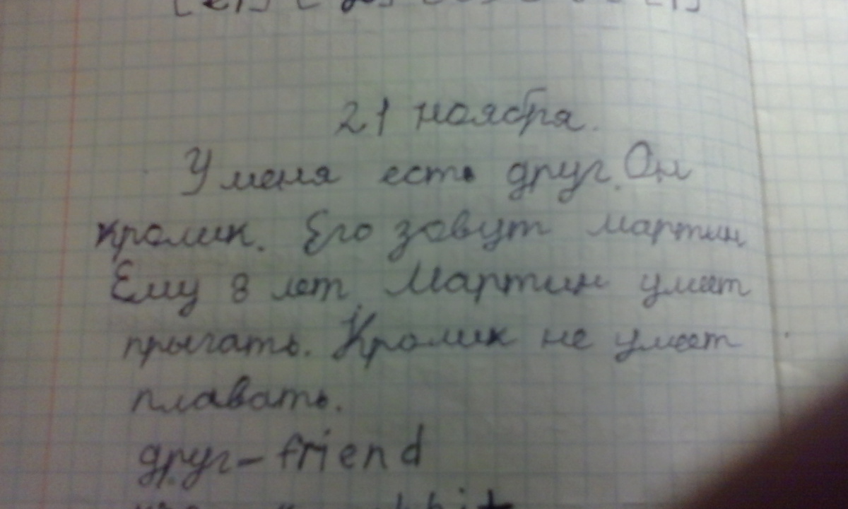 I have a friend. He is a rabbit. His name is Martin. He is 8. Martin can jump. Rabbit can't swim.