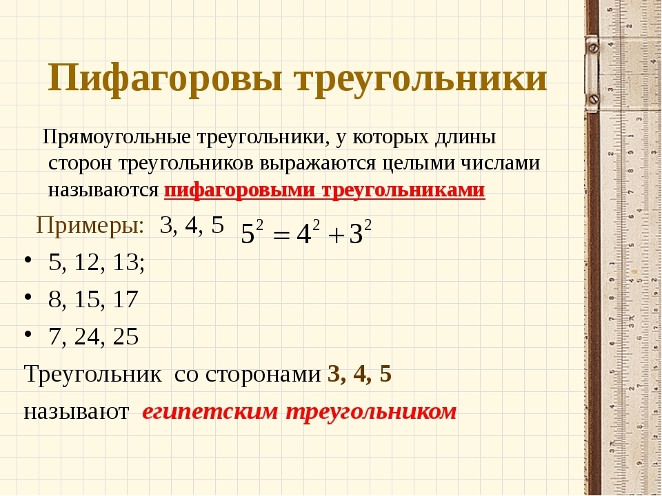 Пифагоровыми треугольниками называют класс прямоугольных треугольников, длины сторон которых выражаются натуральными числами. А тройки таких чисел называются пифагоровыми тройками.