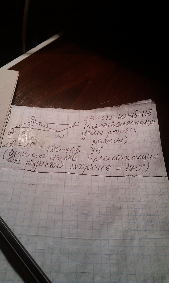 диагональ параллелограмма делит его углы на 45 и 60 градусов ,остальные углы найдите